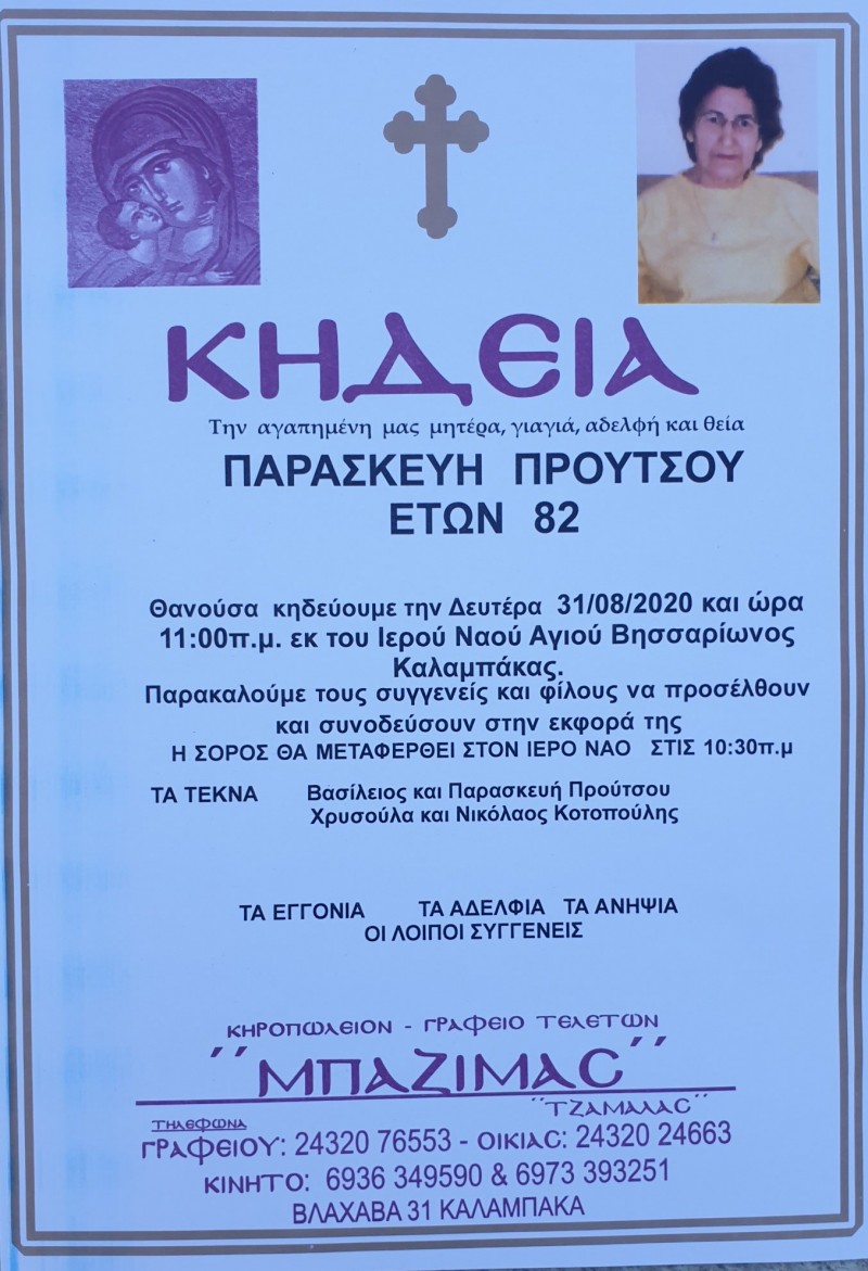 Την κηδεία επιμελείται το γραφείο τελετών ΜΠΑΖΙΜΑΣ ( Το γραφείο μεταφέρθηκε στην διεύθυνση Κονδύλη 4 – Καλαμπάκα )