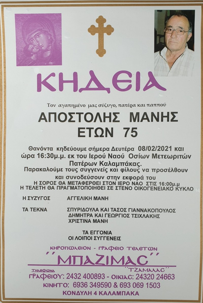 Τον αγαπημένο μας σύζυγο, πατέρα και παππού ΑΠΟΣΤΟΛΗ ΜΑΝΗ ΕΤΩΝ 75 θανόντα κηδεύουμε σήμερα Δευτέρα 08/02/2021 και ώρα 16:30 μ.μ. εκ του Ιερού Ναού Οσίων Μετεωριτών Πατέρων Καλαμπάκας.