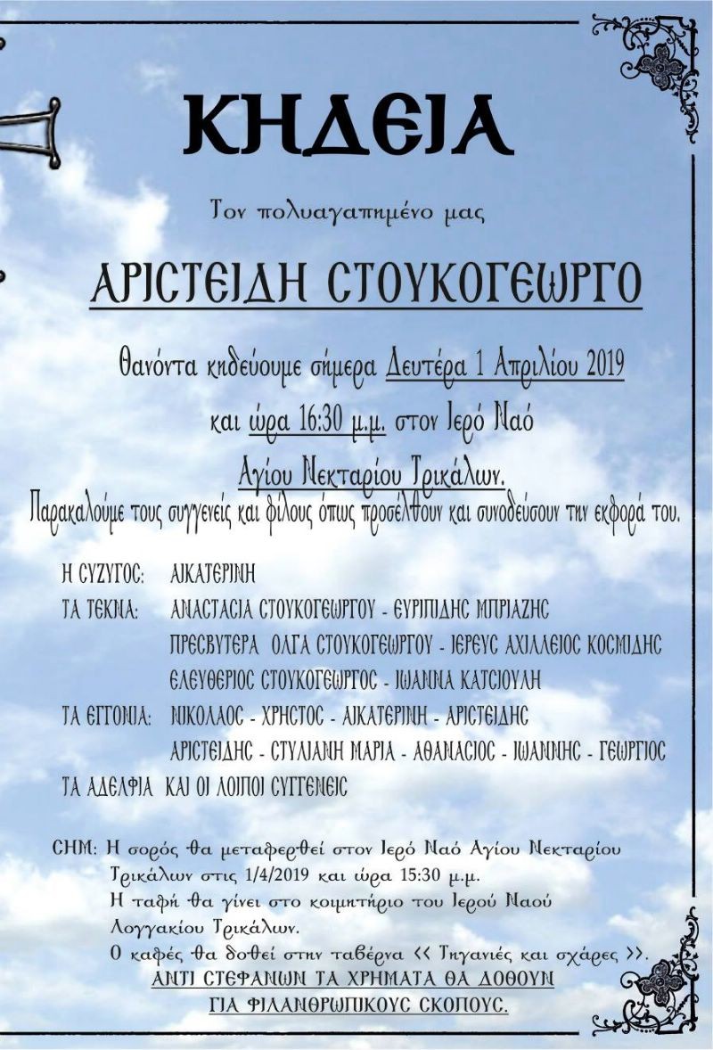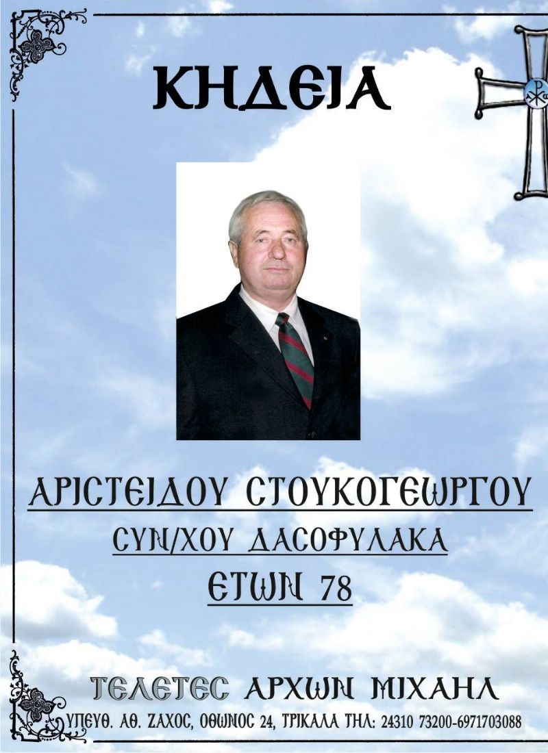 Τον πολυαγαπημένο μας Αριστείδη Στουκογεώργο Συνταξιούχο Δασοφύλακα, θανόντα κηδεύουμε τη Δευτέρα 1 Απριλίου και ώρα 4:30 μ.μ στον Ιερό Ναό Αγίου Νεκταρίου Τρικάλων.