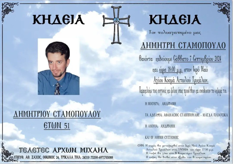 Η κηδεία του θα γίνει το Σάββατο 7 Σεπτεμβρίου και ώρα 18:00 από τον Ιερο Ναό Αγίου Κοσμά του Αιτωλού Τρικάλων.