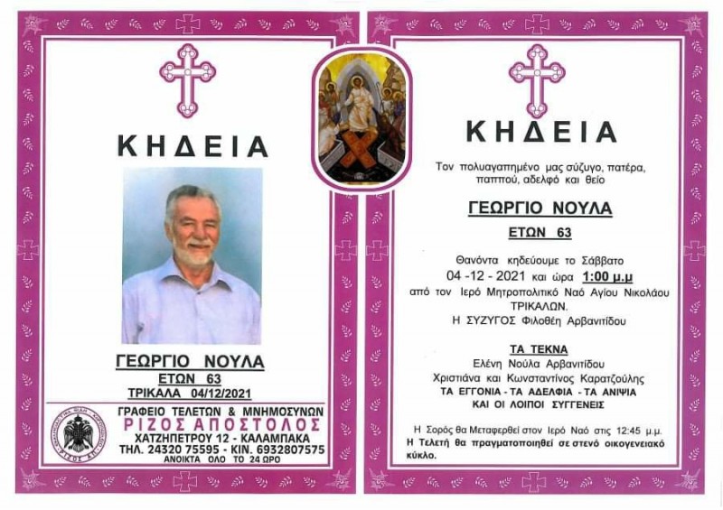 θανόντα κηδεύουμε το Σάββατο 04– 12– 2021 και ώρα 1:00 μ.μ.. από τον Ιερό Μητροπολιτικό Ναό Αγίου Νικολάου Τρικάλων.