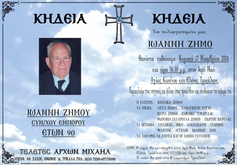 Κηδεύεται την Κυριακή 17 Νοεμβρίου 2024 και ώρα 16:30 μ.μ. στον Ιερό Ναό Αγίου Κων/νου και Ελένης Τρικάλων.