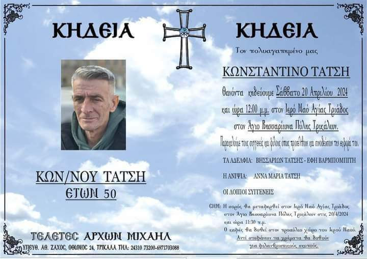 Απεβίωσε ο Κωνσταντίνος Τάτσης 50 ετών Ανακοινώσεις Από admin Δημοσίευση Απρ 19, 2024 -9:32 0 4.281 Κοινοποίηση FacebookTwitterΗλεκτρονικό ΤαχυδρομείοViber Απεβίωσε σε ηλικία 50 ετών ο Κωνσταντίνος Τάτσης. Η κηδεία του θα γίνει το Σάββατο 20 Απριλίου στις 12:00 μ.μ. από τον Ι.Ν Αγίας Τριάδας στον Άγιο Βησσαρίωνα Πύλης. Κηδεία 0 4.281 Κοινοποίηση