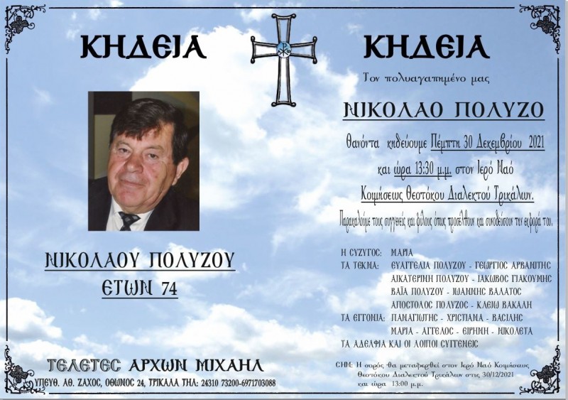 Απεβίωσε ο Νικόλαος Πολύζος Ανακοινώσεις Από admin Δημοσίευση Δεκ 30, 2021 -8:49 0 1.555 Κοινοποίηση FacebookTwitterΗλεκτρονικό ΤαχυδρομείοViber Απεβίωσε ο Νικόλαος Πολύζος σε ηλικία 74 ετών. Η κηδεία του θα γίνει σήμερα Πέμπτη 30 Δεκεμβρίου στις 13:30 από τον Ιερό Ναό Κοιμήσεως της Θεοτόκου Διαλεκτού Τρικάλων. Κηδεία 0 1.555 Κοινοποίηση