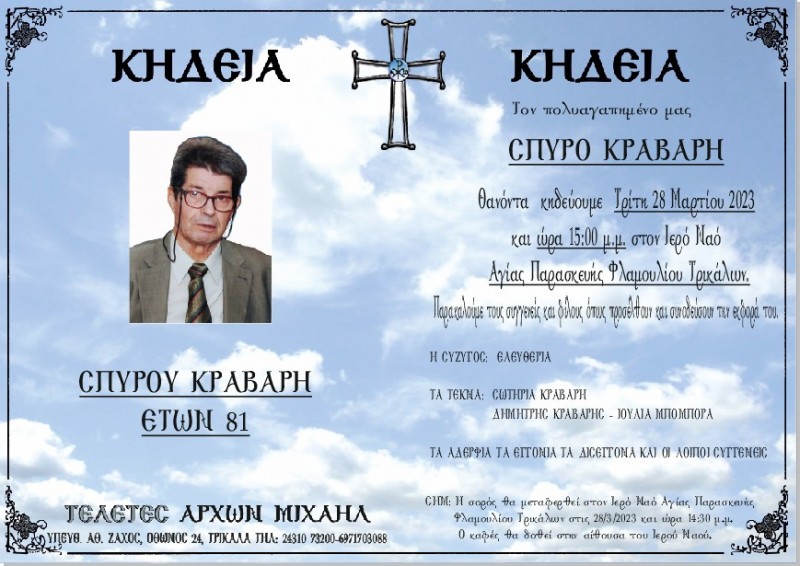 Η κηδεία του θα γίνει την Τρίτη 28 Μαρτίου και ώρα 15:00 από τον Ιερό Ναό Αγίας Παρασκευής Φλαμουλίου Τρικάλων.