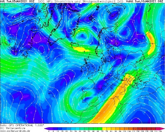 Τι βλέπουμε τώρα από εδώ και πέρα? Μια σπάνια θερμή εισβολή από τα βάθη της σαχάρας θα μας επισκεφθεί το διάστημα Σάββατο 9 Ιανουαρίου ως και  Δευτέρα 11 Ιανουαρίου με πολύ ισχυρούς ΝΔ ανέμους όπως βλέπουμε στον παρακάτω χάρτη των 500hpa
