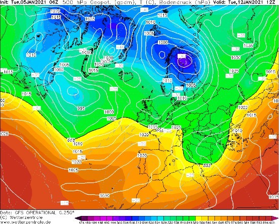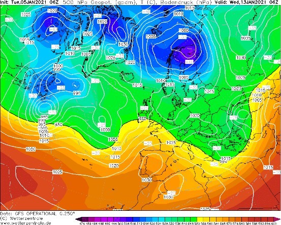 Από της 13-15 Ιανουαρίου και μετά πέρα από το αρκετό κρύο στην περιοχή μας ,τον αν έχουμε μια ισχυρή κακοκαιρία στην περιοχή μας θα εξαρτηθεί από το πόσο μπορεί να αντέξει ο αντικυκλώνας στην δυτική Ευρώπη και το πόσο ισχυρός θα είναι ο ίδιος αλλά και ο συνδυασμός με το χαμηλό στην Σκανδιναβική ώστε να τροφοδοτεί την περιοχή μας με πολύ ψυχρές μάζες όπως βλέπουμε στον παρακάτω χάρτη