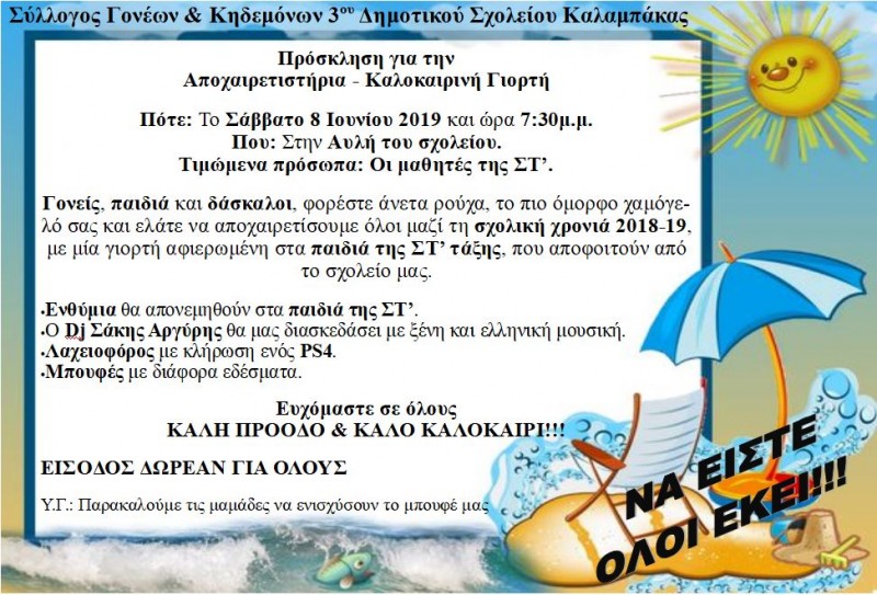 Ο Σύλλογος Γονέων & Κηδεμόνων του 3ου Δημοτικού Σχολείου Καλαμπάκας, σας προσκαλεί στην Αποχαιρετιστήρια – Καλοκαιρινή Γιορτή που διοργανώνει το Σάββατο 8 Ιουνίου 2019 & ώρα 7:30μ.μ., στην αυλή του σχολείου.