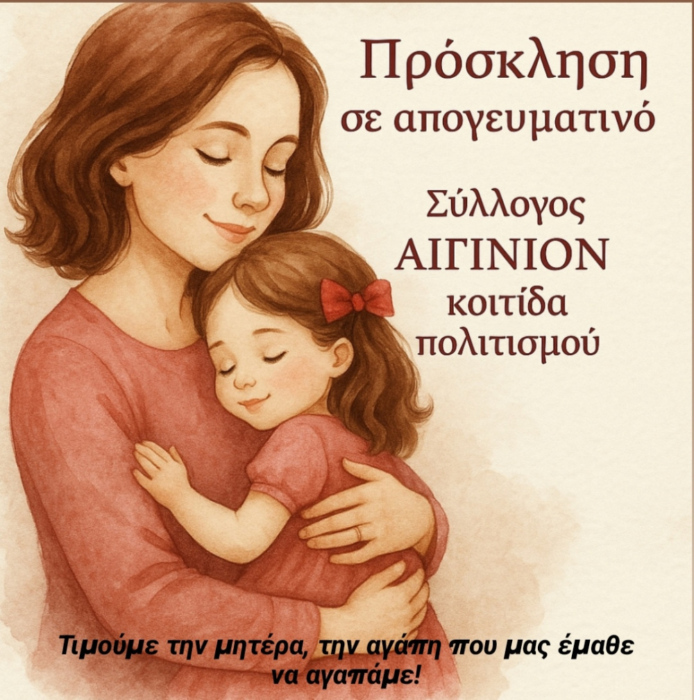 Ο Σύλλογος «ΑΙΓΙΝΙΟΝ – Κοιτίδα Πολιτισμού» σας προσκαλεί σε ένα όμορφο απογευματινό, την Κυριακή 11 Μαΐου, στις 6:00 μ.μ., στο καφέ-μπαρ «Αέρινο» για να τιμήσουμε τη μητέρα, τη γυναίκα που μας έμαθε τι σημαίνει αγάπη.