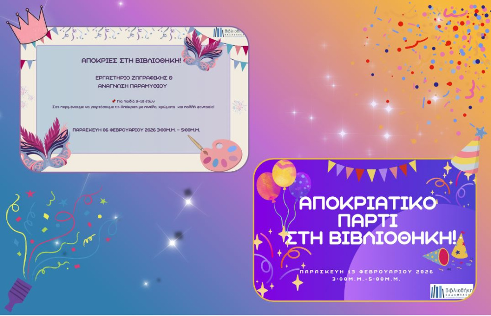 Αποκριάτικο Πάρτι στη Βιβλιοθήκη με μουσική, κεράσματα και ψυχαγωγικές δραστηριότητες. Οι συμμετέχοντες καλούνται να φορέσουν αποκριάτικες στολές.