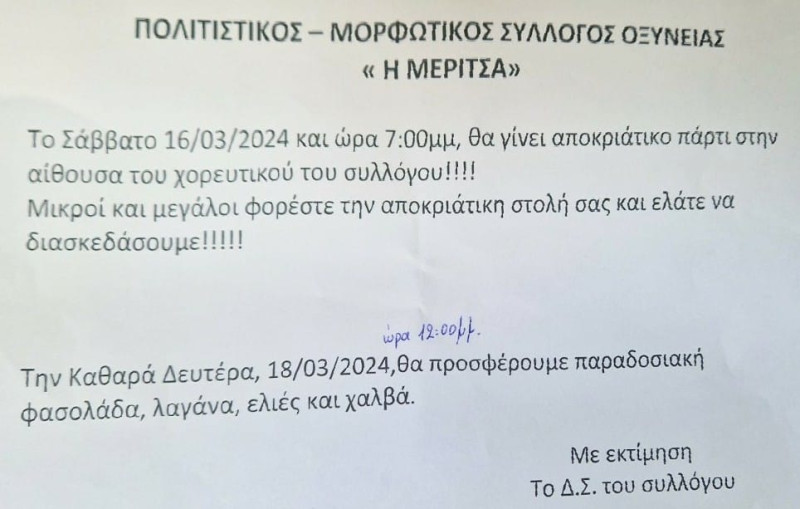 Ο Πολιτιστικός – Μορφωτικός Σύλλογος Οξύνειας “Η Μερίτσα” το Σάββατο 16/3/2024 και ώρα 19:00 πραγματοποιεί αποκριάτικη εκδήλωση στα γραφεία του Συλλόγου στην Οξύνεια.