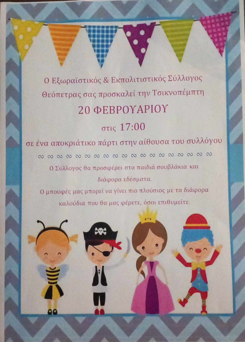 Ο Εξωραϊστικός & Εκπολιτιστικός Σύλλογος Θεόπετρας σας προσκαλεί την Τσικνοπέμπτη 20 ΦΕΒΡΟΥΑΡΙΟΥ στις 17:00 σε ένα αποκριάτικο πάρτι στην αίθουσα του συλλόγου.