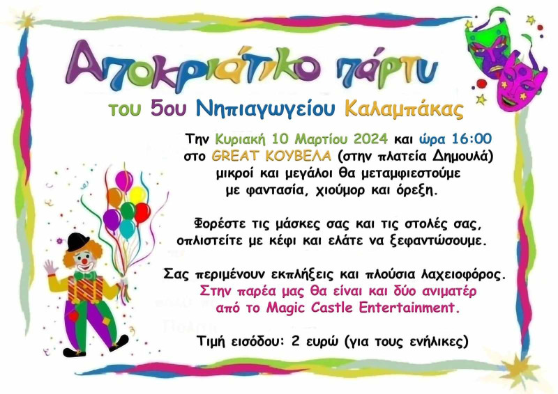 Την Κυριακή 10 Μαρτίου 2024 και ώρα 16:00 στο GREAT ΚΟΥΒΕΛΑ ( στην πλατεία Δημουλά ) μικροί και μεγάλοι θα μεταμφιεστούμε με φαντασία, χιούμορ και όρεξη.