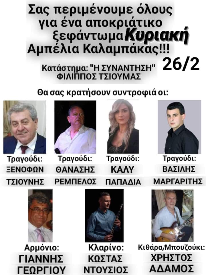 Αποκριάτικο ξεφάντωμα έχει ετοιμάσει για την Κυριακή 26 Φεβρουαρίου το κατάστημα  Η ΣΥΝΑΝΤΗΣΗ του Φίλιππου Τσιούμα στα Αμπέλια Καλαμπάκας.