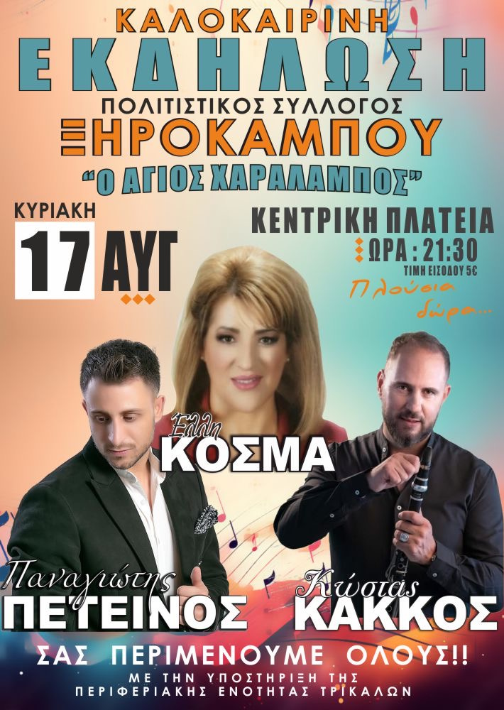 Στην εκδήλωση θα συμμετέχουν οι καλλιτέχνες Έλλη Κόσμα, Παναγιώτης Πετεινός και Κώστας Κάκκος, προσφέροντας ένα μουσικό πρόγραμμα για όλους!
