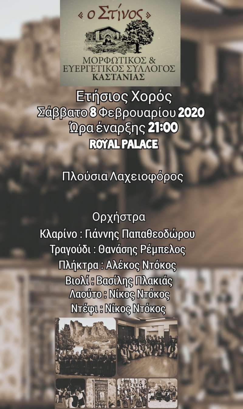 Με χαρά σας γνωστοποιούμε τον ετήσιο χορό του Χωριού μας, ο οποίος θα λάβει χώρα  το Σάββατο 08 Φεβρουαρίου 2020 στο κοσμικό κέντρο «Royal Palace – Πώχος» επί του 2ου χλμ Καλαμπάκας – Τρικάλων.