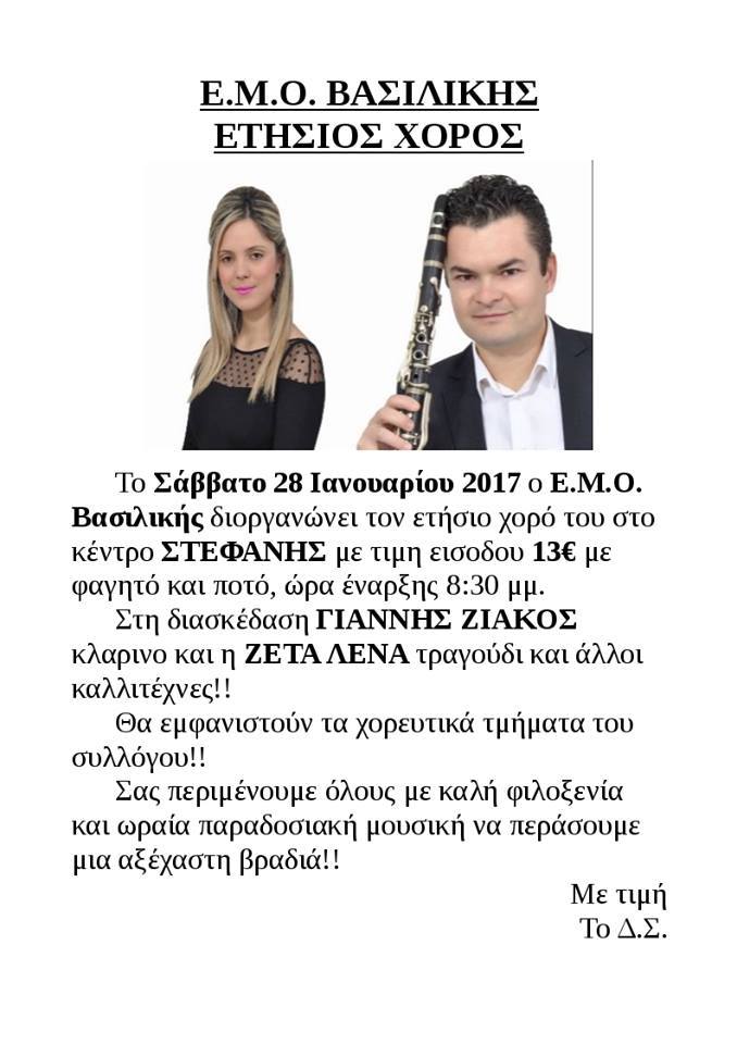 Απόψε, Σάββατο 28 Ιανουαρίου στο κέντρο “Στεφανής” θα γίνει ο ετήσιος χορός του Ε.ΜΟ. Βασιλικής “Η Κυρά Βασιλική”.