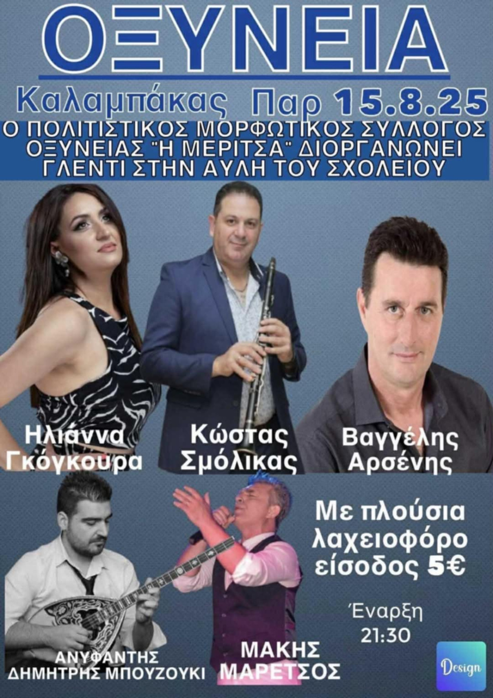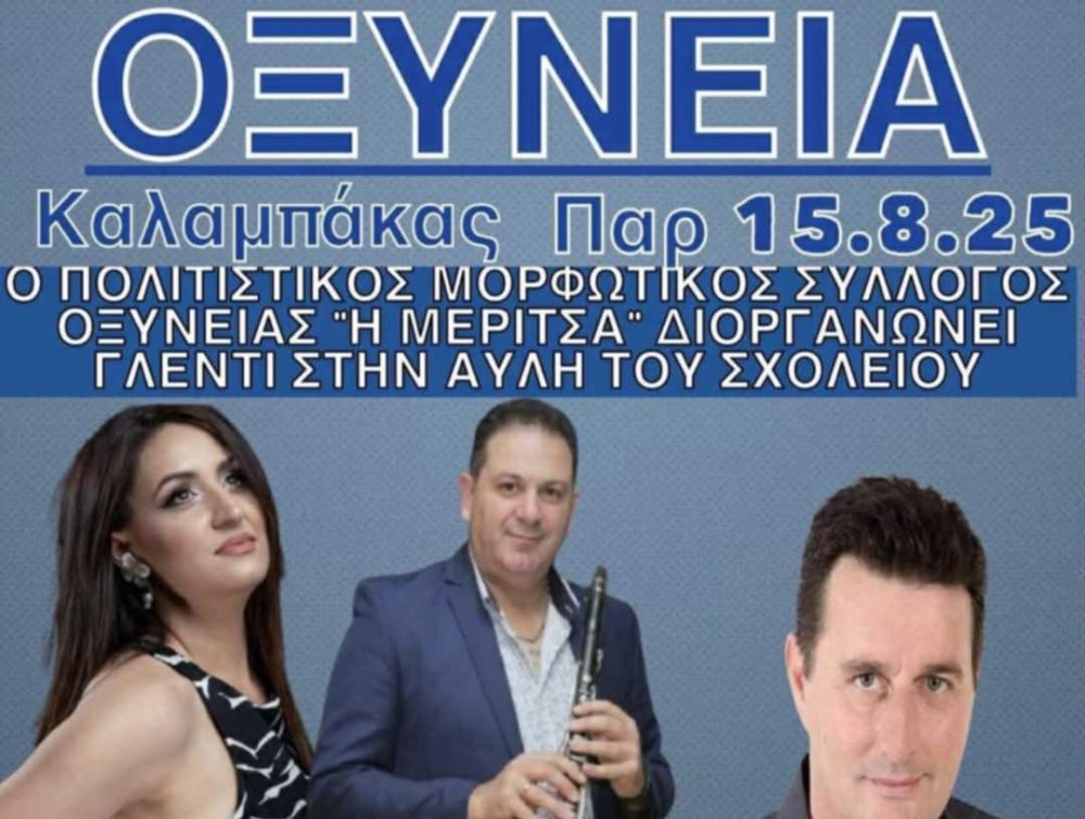 Ο Πολιτιστικός Μορφωτικός Σύλλογος Οξύνειας “Η Μερίτσα” σας προσκαλεί σε ένα παραδοσιακό γλέντι στην αυλή του σχολείου την απόψε Παρασκευή 15 Αυγούστου 2025, με ώρα έναρξης 21:30.