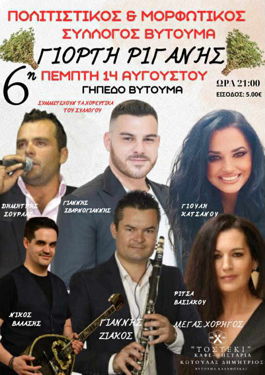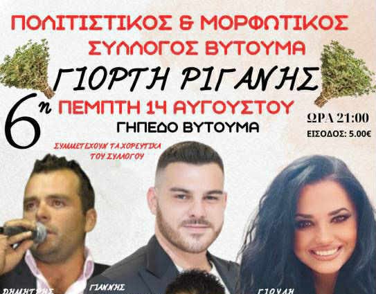 Ο Πολιτιστικός & Μορφωτικός Σύλλογος Βυτούμα σας προσκαλεί στην 6η Γιορτή Ρίγανης, που θα πραγματοποιηθεί απόψε Πέμπτη 14 Αυγούστου στο Γήπεδο Βυτούμα, με ώρα έναρξης 21:00.