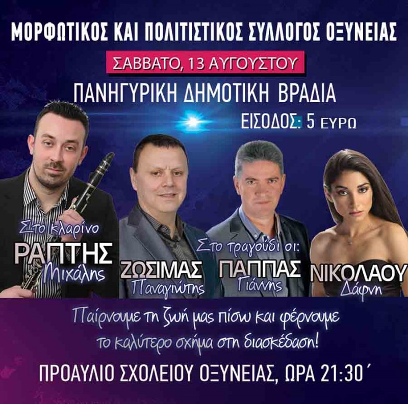 Απόψε Σάββατο 13 Αυγούστου στην Οξύνεια διασκεδάστε με Ράπτη, Ζωσιμά, Παππά και Δάφνη Νικολάου