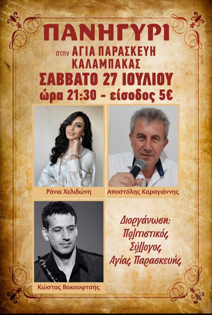 Πανηγύρι στην Αγία Παρασκευή Καλαμπάκας διοργανώνει απόψε Σάββατο 27 Ιουλίου 2024 ο Πολιτιστικός Σύλλογος Αγίας Παρασκευής.