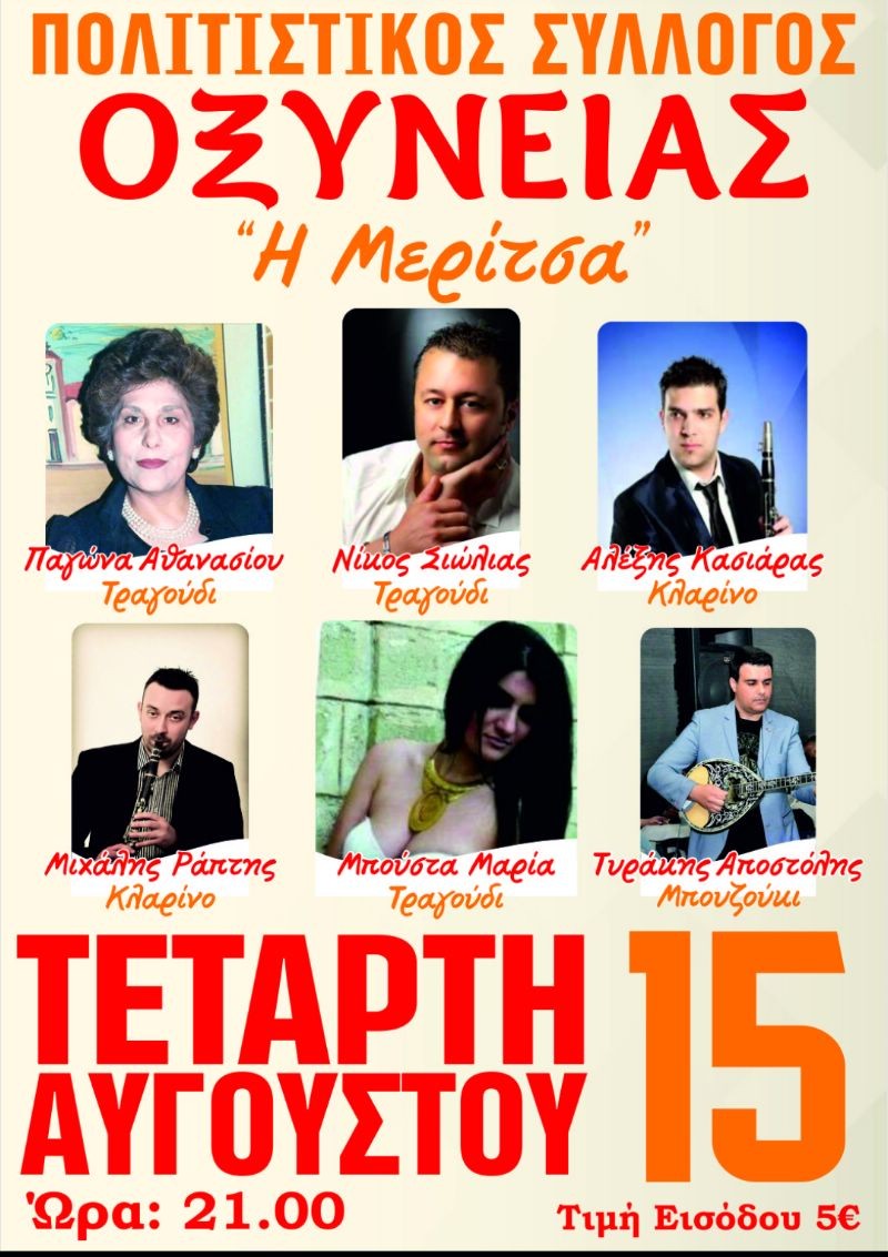 Απόψε, Τετάρτη 15 Αυγούστου ο Πολιτιστικός Σύλληγος Οξύνειας “Η ΜΕΡΙΤΣΑ” διοργανώνει την μεγάλη καλοκαιρινή εκδήλωση.