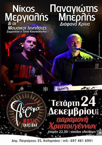 Απόψε στο Αέρινο οι Νίκος Μεργιαλής & Παναγιώτης Μπερλής μαζί με τους Μουσικούς Ιχνηλάτες και την Τόνια Κιουπελόγλου γιορτάζουν τραγουδώντας ζωντανά επί σκηνής το βράδυ της Παραμονής των Χριστουγέννων κάτω από τα επιβλητικά Μετέωρα, στο φιλόξενο, ζεστό και γιορτινό Αέρινο Καφέ Μπαρ!!