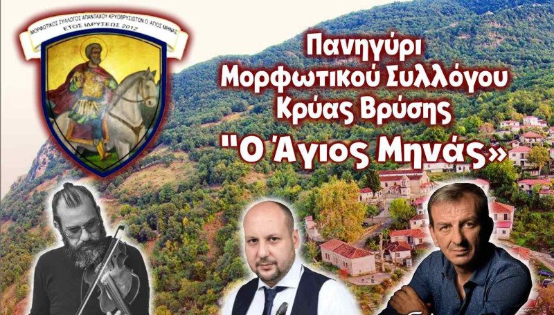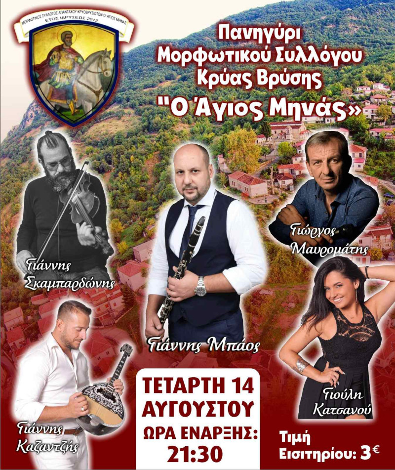 Ο Μορφωτικός Σύλλογος Απανταχού Κρυοβρυσιωτών “Ο Άγιος Μηνάς” διοργανώνει απόψε Τετάρτη 14 Αυγούστου το μεγάλο πανηγύρι.
