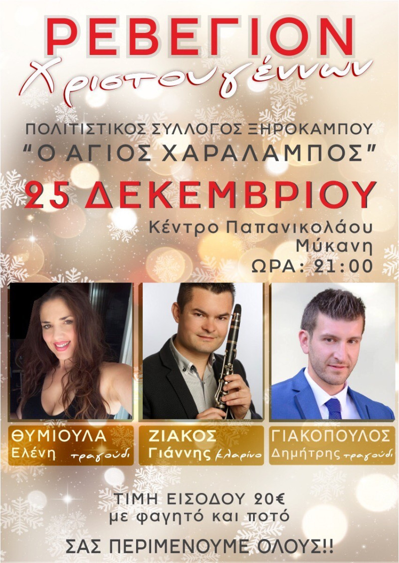 Απόψε, Τετάρτη 25 Δεκεμβρίου ανήμερα των Χριστουγέννων ο Πολιτιστικός Σύλλογος Ξηροκάμπου “Άγιος Χαράλαμπος” πραγματοποιεί το μοναδικό Ρεβεγιόν Χριστουγέννων και σας καλεί όλους να διασκεδάσετε μαζί του στο κέντρο “Παπανικολάου” στην Μύκανη.