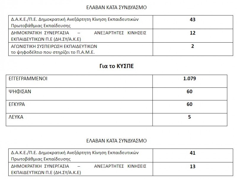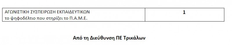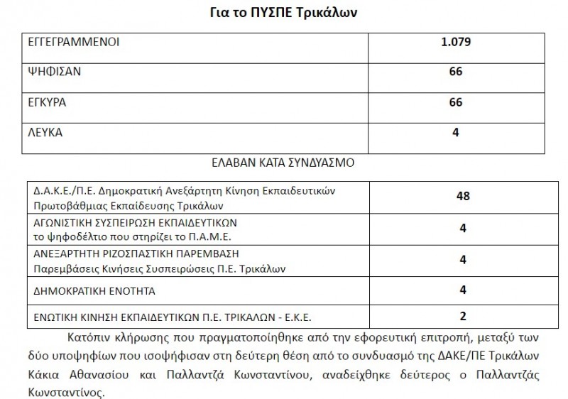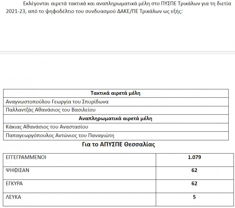 Από τη Διεύθυνση Π.Ε. Τρικάλων ανακοινώνονται τα αποτελέσματα των εκλογών για την ανάδειξη αιρετών εκπροσώπων που διεξήχθησαν το Σάββατο, 7/11/2020, στα υπηρεσιακά συμβούλια ως εξής: