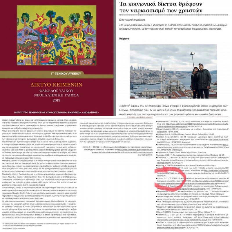 Άρθρο του Ψυχιάτρου και Διδάκτορος του Πανεπιστημίου Αθηνών, Χρίστου Λιάπη MD, MSc, PhD, περιλαμβάνεται στο καινούριο βιβλίο «Εμείς και οι άλλοι», που διδάσκεται από φέτος στη στη Γ´ Γενικού Λυκείου, για τη Νεοελληνική Γλώσσα. Πρόκειται για το άρθρο με τίτλο «Τα κοινωνικά δίκτυα υποθάλπτουν τον ναρκισσσισμό των χρηστών», το οποίο είχε δημοσιευθεί στην «Καθημερινή», τον Φεβρουάριο του  2016.