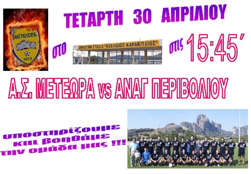 Κάλεσμα στους φιλάθλους και στους κατοίκους της πόλης και περιοχής απευθύνει με σχετική αφίσα η ιστορική ομάδα του Α.Σ Μετέωρα στο παιχνίδι της Τετάρτης με την Αναγέννηση Περιβολίου.