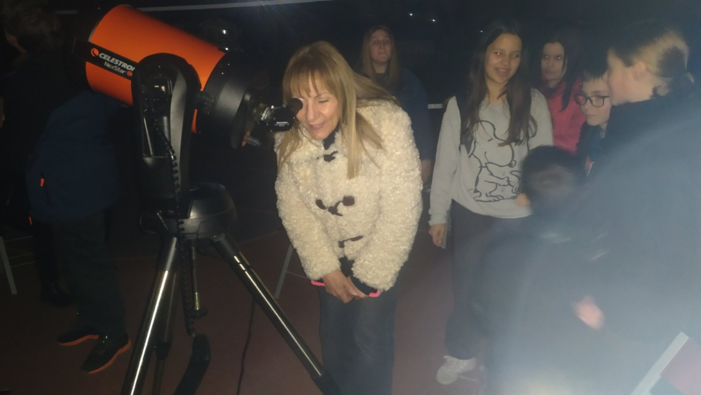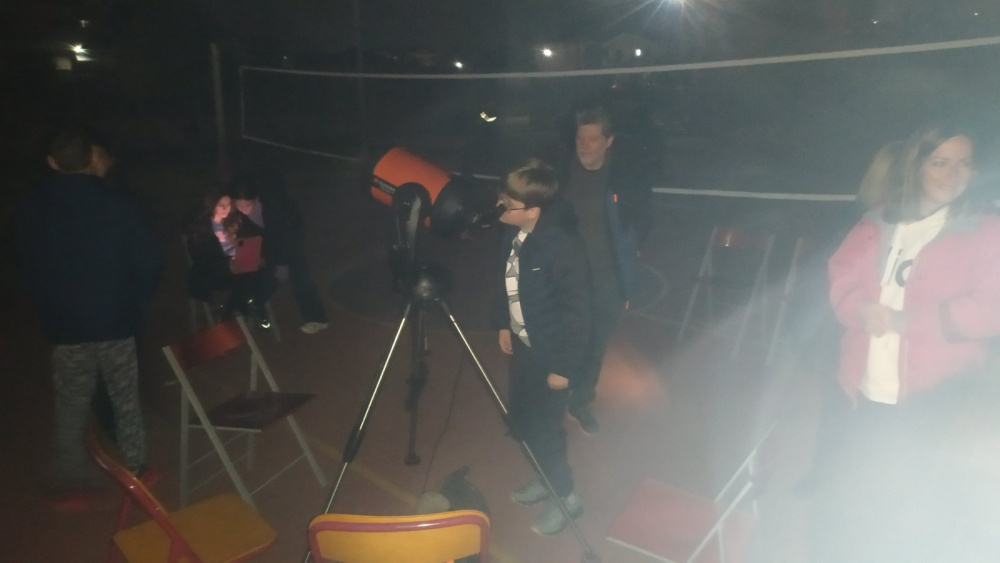 Στη συνέχεια μεταφερθήκαμε στην αυλή και στο τηλεσκόπιο για την παρατήρηση. Κατά τη διάρκειά της  είδαμε τη Σελήνη και τους κρατήρες της, τον Δία και τους δορυφόρους του, Ιώ, Καλλιστώ, Ευρώπη και Γανυμήδη, δηλαδή τέσσερις από τους 95 (!), τις  διαφορές μεταξύ ενός «κίτρινου νάνου», που είναι και ο ήλιος μας, ενός «ερυθρού υπεργίγαντα», του Betelgeuse στον αστερισμό του Ωρίωνα και ενός «μπλε υπεργίγαντα», του Rigel. Κάναμε επίσης ένα σύντομο ταξίδι μέσα από τη μυθολογία αλλά και την ιστορία της ανθρωπότητας (αραβικές ονομασίες αστέρων).