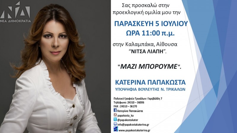 Την Παρασκευή 5 Ιουλίου στις 11:00 το πρωί στην αίθουσα “Νίτσα Λιάπη” της πόλης μας θα πραγματοποιήσει την προεκλογική της ομιλία η συντοπίτισσά μας Υποψήφια Βουλευτής της Ν.Δ στο Νομό Τρικάλων κα Κατερίνα Παπακώστα.