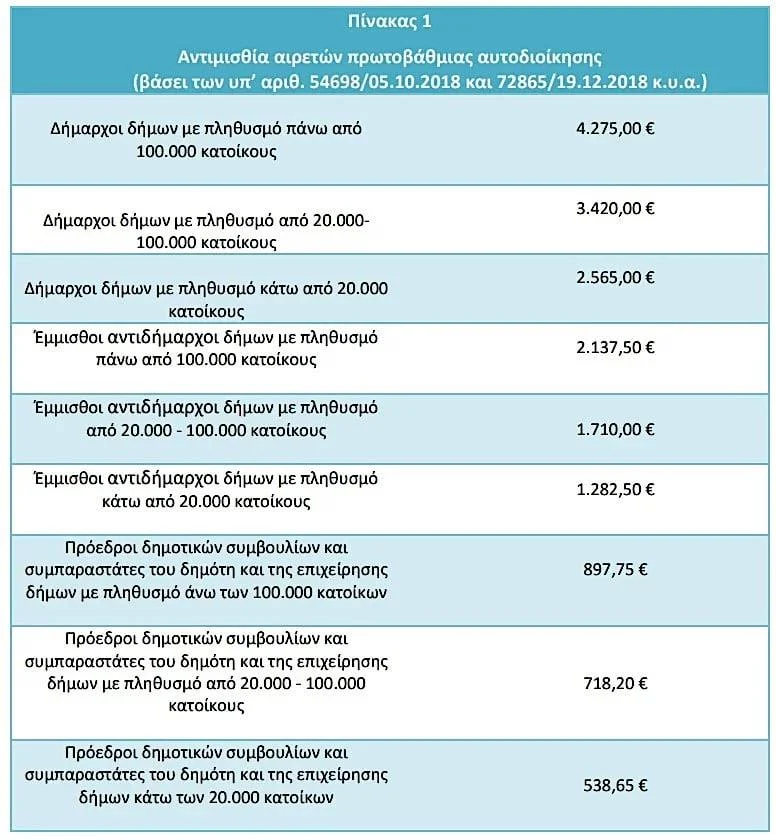 Σύμφωνα με τη σχετική απόφαση, οι δήμαρχοι δήμων με πληθυσμό άνω των 100.000 κατοίκων, αμείβονται με 4.275 ευρώ, ενώ οι δήμαρχοι δήμων με πληθυσμό από 20.000-100.000 αμείβονται με 3.420 ευρώ.