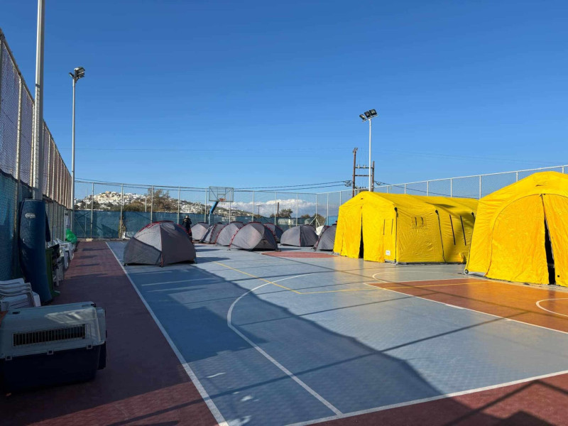 Οι σκηνές που έχουν στηθεί στο γήπεδο προορίζονται αποκλειστικά για τη διαμονή και τις επιχειρησιακές ανάγκες της ΕΜΑΚ, η οποία βρίσκεται σε ετοιμότητα για οποιοδήποτε ενδεχόμενο, σύμφωνα με το cyclades24.gr.