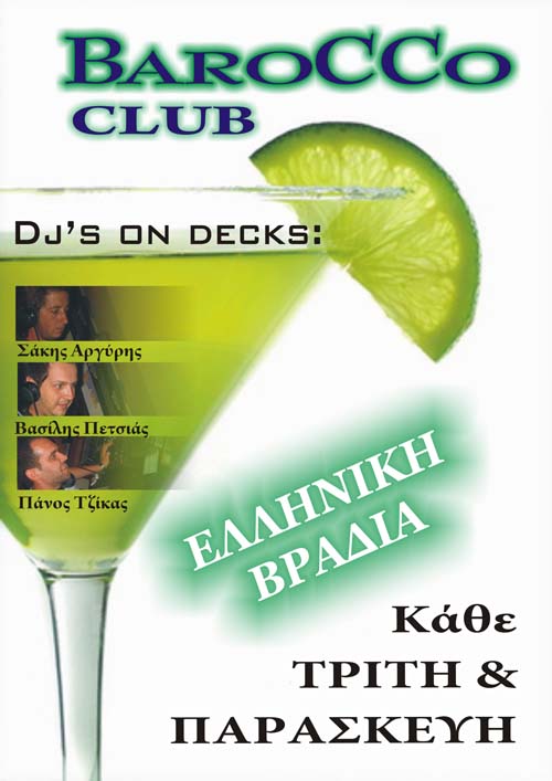 Συνεχίζει το Barocco Club μέσα στο καλοκαίρι να ομορφαίνει τις βραδιές μας και να μας δίνει το ερέθισμα να βγαίνουμε από το σπίτι και να διασκεδάζουμε ως το πρωί. Κάνει πάλι την διαφορά προσφέροντας Ελληνικές βραδιές για τους λάτρεις της Ελληνικής μουσικής με παλιές και καινούργιες επιτυχίες.