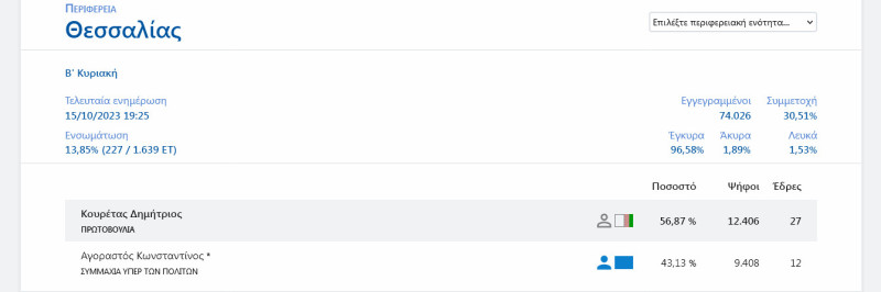 Ο Δημήτρης Κουρέτας είναι μπροστά στα πρωτα αποτελέσμστα όπως ανακοινώνονται από το Υπουργείο Εσωτερικών σε επίπεδο Θεσσαλίας.