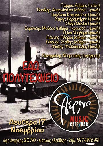 Απόψε Δευτέρα 17 Νοεμβρίου στο μουσικό καφέ ΑΕΡΙΝΟ της πόλης μας, μια εκδήλωση μνήμης για την επέτειο των 41 χρόνων από την εξέγερση του Πολυτεχνείου