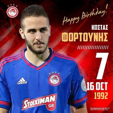 «Χρόνια πολλά στον ποδοσφαιριστή της ομάδας μας, Κώστα Φορτούνη», γράφει η ΠΑΕ Ολυμπιακός στη λεζάντα με τη φωτογραφία του διεθνούς μεσοεπιθετικού, ο οποίος σήμερα γιορτάζει τα 23α γενέθλιά του».