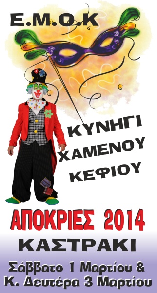 Ώρα 13:30-14:30 – Πλατεία Καστρακίου – Θεατρικό παιχνίδι για όλα τα μικρά παιδιά από το Θεατρικό Εργαστήρι” Επί Σταγών “ και την υπεύθυνη του εργαστηρίου κα. Μαρία Μπλούτσου Το πιο ξεκαρδιστικό περιπετειώδες, αναπάντεχο, αποκριάτικο θεατρικό παιχνίδι, για τους μικρούς μας φίλους.