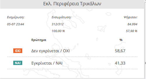 «ΟΧΙ» το τελικό αποτέλεσμα στο Νομό Τρικάλων