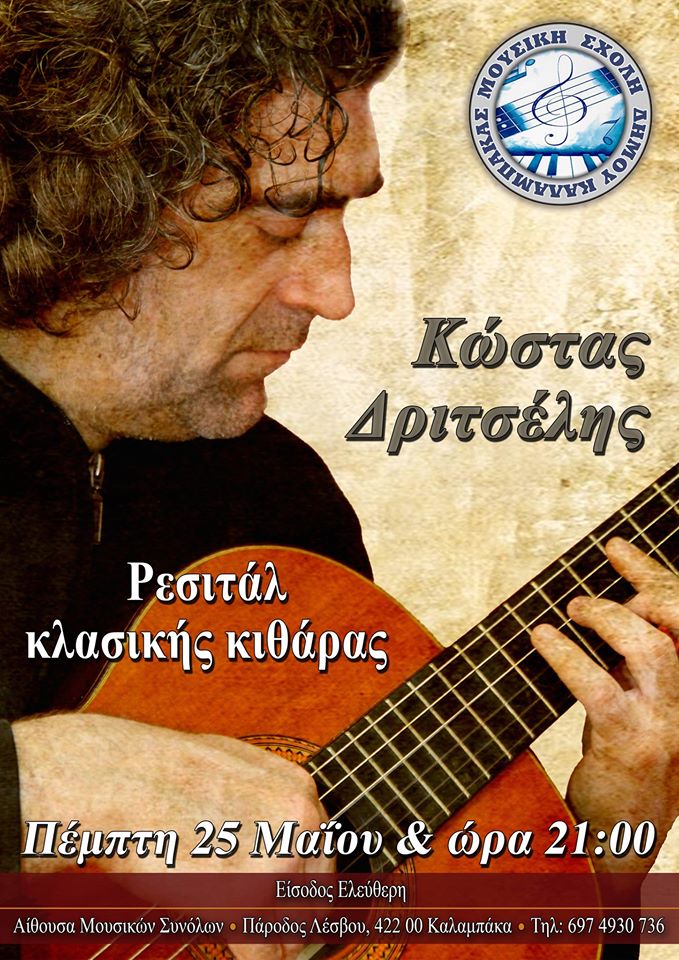 Με το Ρεσιτάλ Κιθάρας του Κώστα Δριτσέλη πέφτει η αυλαία των εκδηλώσεων του Οδηγού Ακρόασης 2016-17 στη Μουσική Σχολή Δήμου Καλαμπάκας.