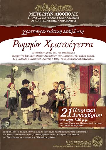 Στο πλαίσιο της μεγάλης δεσποτικής εορτής των Χριστουγέννων, ο Σύλλογος “Μετεώρων Λιθόπολις” διοργανώνει χριστουγεννιάτικη εκδήλωση με τίτλο «Ρωμηών Χριστούγεννα», που θα πραγματοποιηθεί την Κυριακή 21 Δεκεμβρίου και ώρα 7:30 μ.μ. στο αμφιθέατρο του Πνευματικού Κέντρου του δήμου Καλαμπάκας.