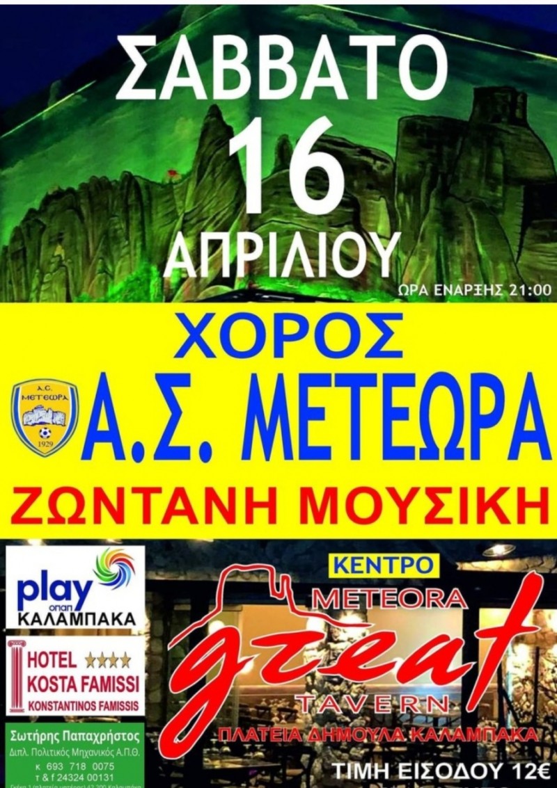 Ο ΑΣ Μετέωρα διοργανώνει χορό το Σάββατο 16 Απριλίου στο Κέντρο Meteora great Tavern που βρίσκεται στην Πλατεία Δημουλά της Καλαμπάκας.