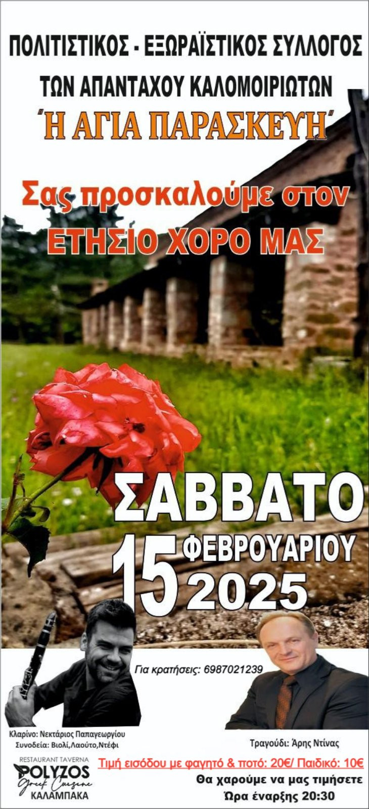 Το Σάββατο 15 Φεβρουαρίου 2025 θα πραγματοποιηθεί ο ετήσιος χορός του Πολιτιστικού – Εξωραϊστικού Συλλόγου των Απανταχού Καλομοιριωτών “Η Αγία Παρασκευή”. στο Εστιατόριο POLYZOS.