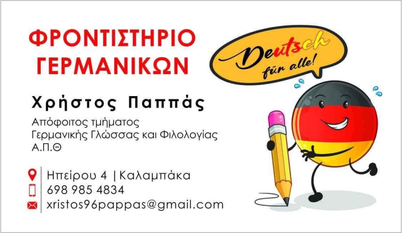 Το σύγχρονο φροντιστήριο Γερμανικών στην Καλαμπάκα “Deutsch für alle“ του καθηγητή Χρήστου Παππά με την απόλυτη επιτυχία στις περσινές εξετάσεις ανοίγει και πάλι να υποδεχτεί τους μαθητές του αλλά και τους νεοενδιαφερόμενους για την νέα σχολική χρονιά