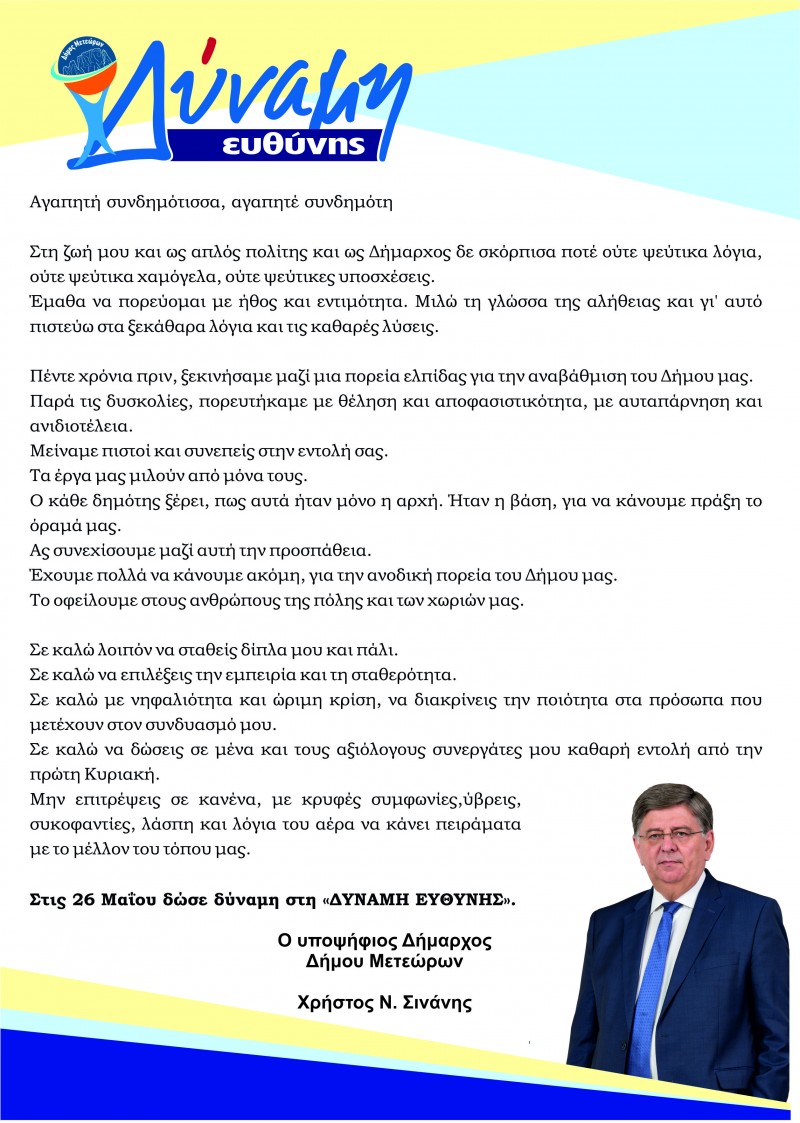 Χρήστος Σινάνης – Υπ. Δήμαρχος Δ. Μετεώρων: Επιστολή για τους πολίτες του Δήμου Μετεώρων