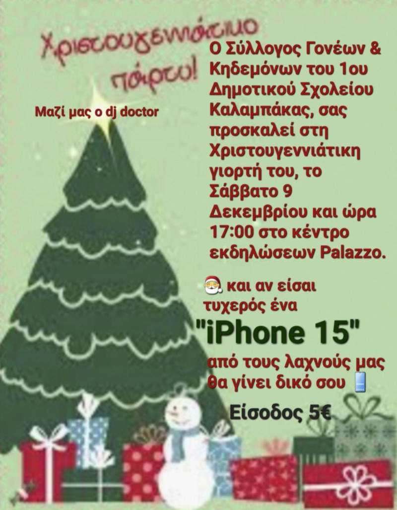 Ο Σύλλογος Γονέων και Κηδεμόνων του 1ου Δημοτικού Σχολείου Καλαμπάκας, σας προσκαλεί στη Χριστουγεννιάτικη γιορτή του, το Σάββατο 9 Δεκεμβρίου και ώρα 17:00 στο κέντρο εκδηλώσεων Palazzo.