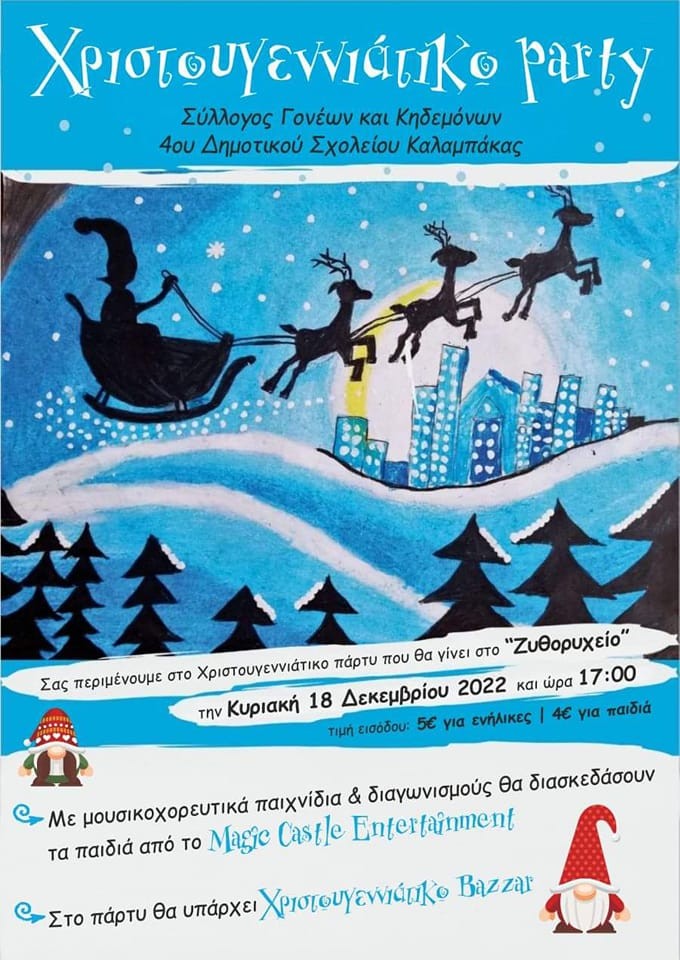 Χριστουγεννιάτικο PARTY διοργανώνει την Κυριακή 18 Δεκεμβρίου, στις 17:00 το απόγευμα στο “Ζυθορυχείο” στην πλατεία Δημουλα Καλαμπάκας ο Σύλλογος Γονέων και Κηδεμόνων του 4ου Δημοτικού Σχολείου Καλαμπάκας.